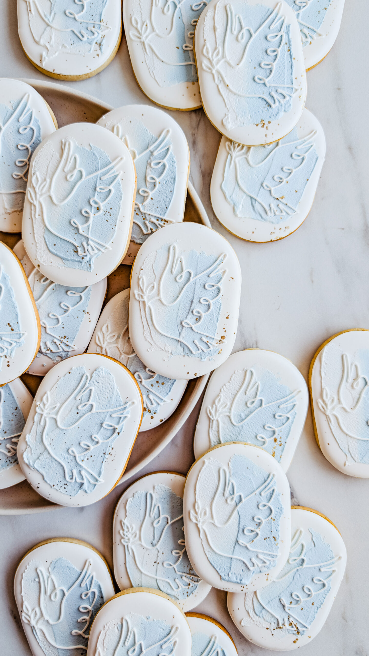Ręcznie lukrowane ciasteczka & pierniczki w kształcie owalnej etykietki z gołębicą.