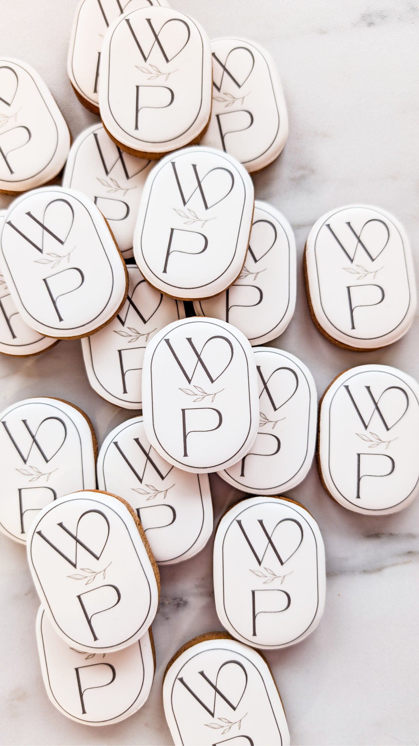 Ciasteczko/ pierniczek w kształcie owalnej etykietki z inicjałami. Ręcznie dekorowane lukrem królewskim oraz jadalnym nadrukiem.
