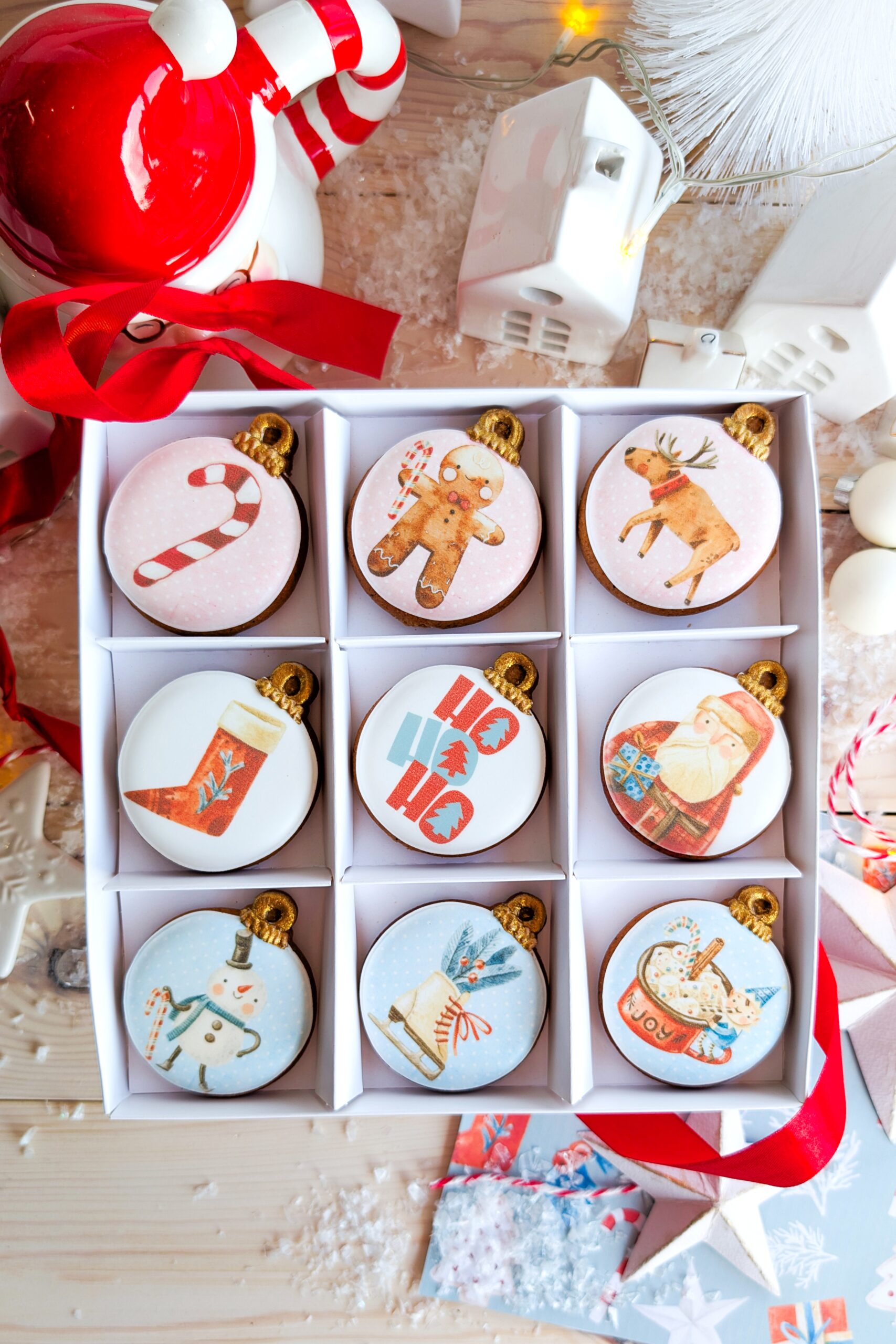 Zestaw 9 pierniczków świątecznych w kształcie bombki, z dziurką do powieszenia na choince.